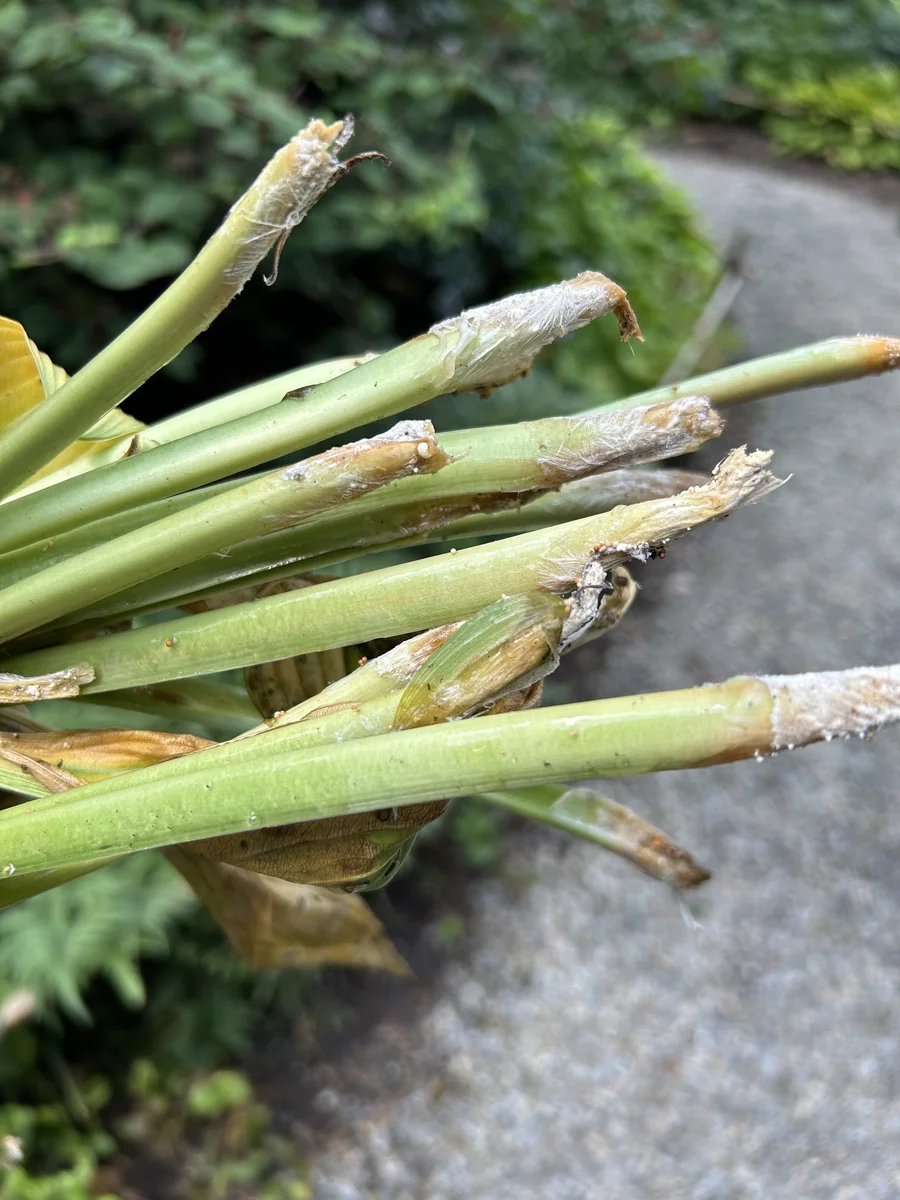 Diagnoza wizualna: Biała, sznurowata grzybnia + małe, brązowe sklerocja u podstawy roślin są diagnostyczne.