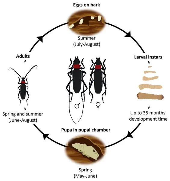 Poczwarka: wolna, biaława, 26–36 mm długości, formowana w komorze poczwarkowej w twardzieli.