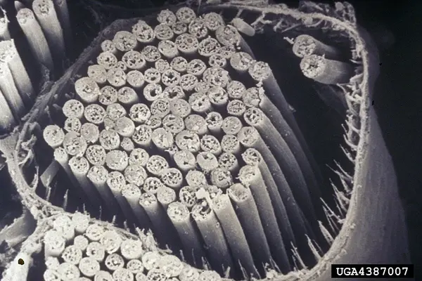Transmisja wtórna: samice składają jaja na osłabionych/obumierających drzewach, wprowadzając nicieniów do drewna.