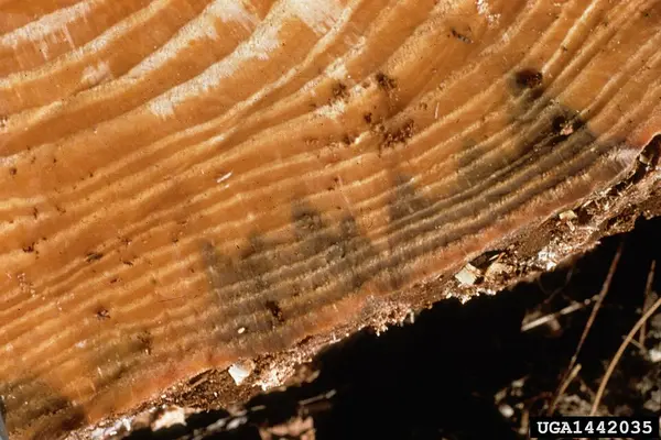 Objawy wizualne: zmniejszone wydzielanie żywicy, żółknięcie i więdnięcie igieł, brązowienie i zamieranie korony. Drzewa mogą umrzeć w ciągu 2–3 miesięcy od zarażenia.