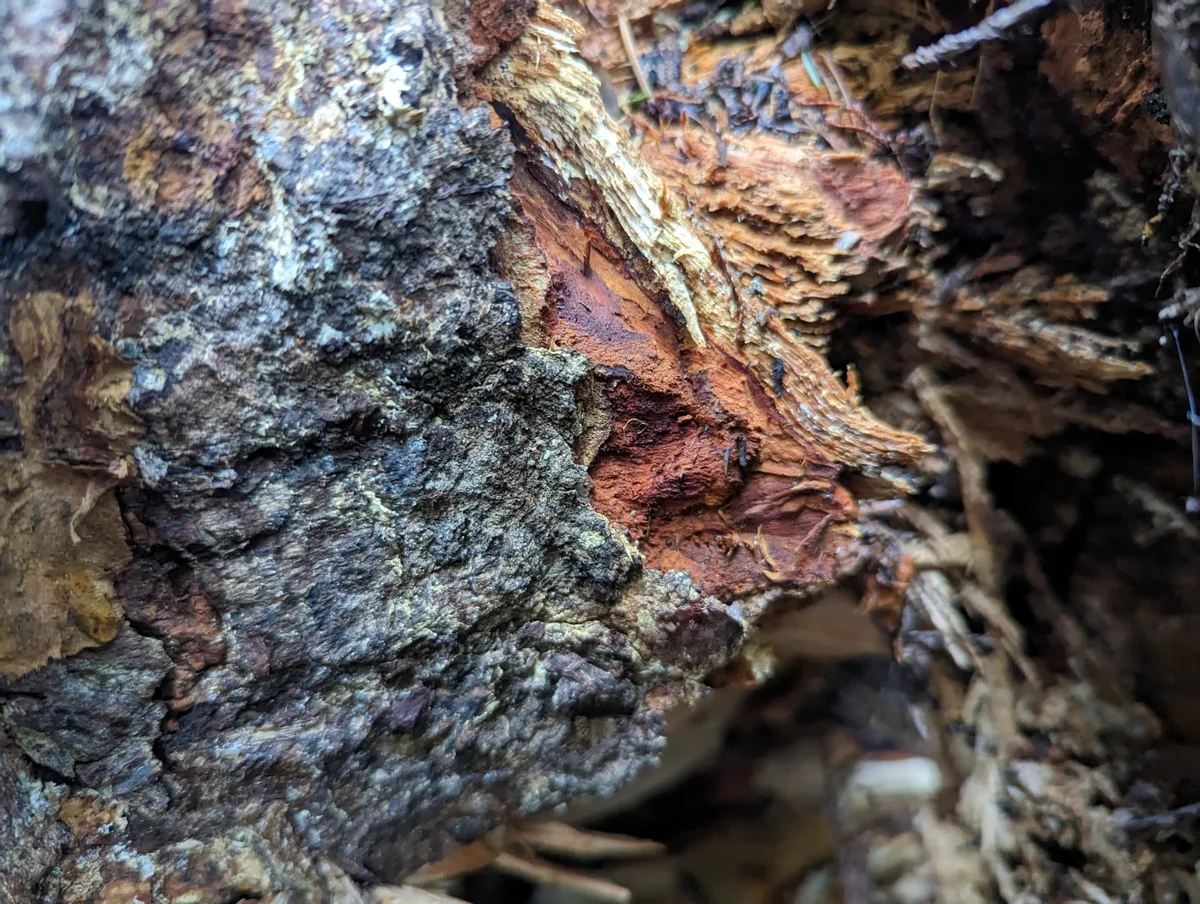 Drewno ulega stopniowemu rozkładowi. Na świeżo ściętym drzewie początkowy rozkład drewna ma postać czerwonawo-brązowej lub czekoladowo-brązowej plamy występującej w zewnętrznym twardzielu i bieli. Patrząc na pień świeżo ściętego drzewa, przebarwienie często ma nieregularny kształt półksiężyca do półkola, z grubsza wzdłuż krzywizny porażonych pierścieni wzrostu.