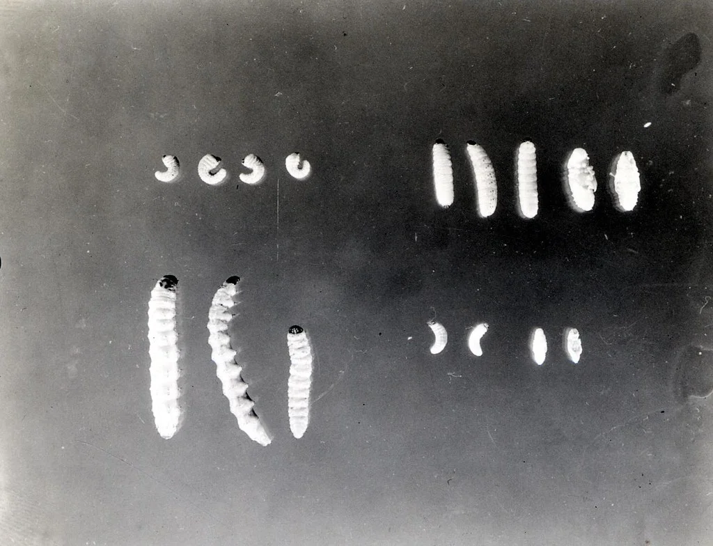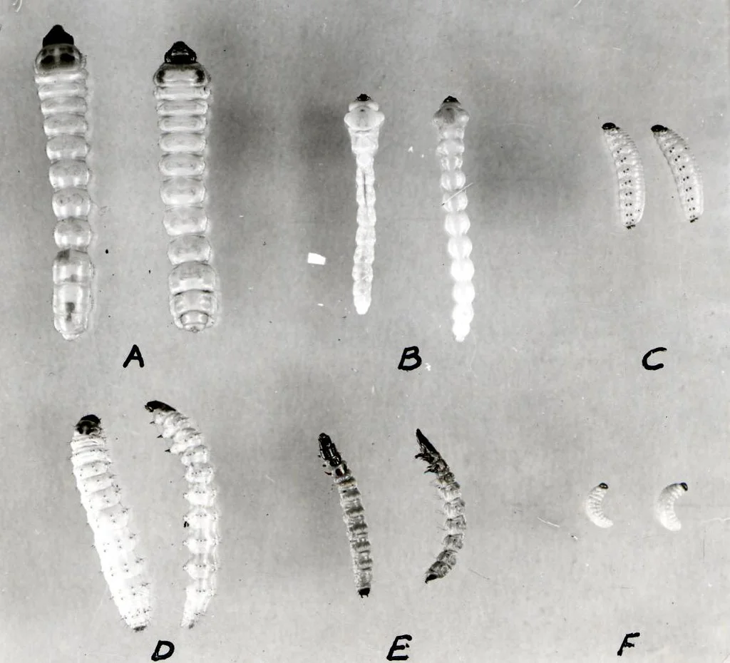 Larwy białe, beznogie, kształtu litery „C”, z brązową torebką głowową. Osiągają do 12 mm długości.