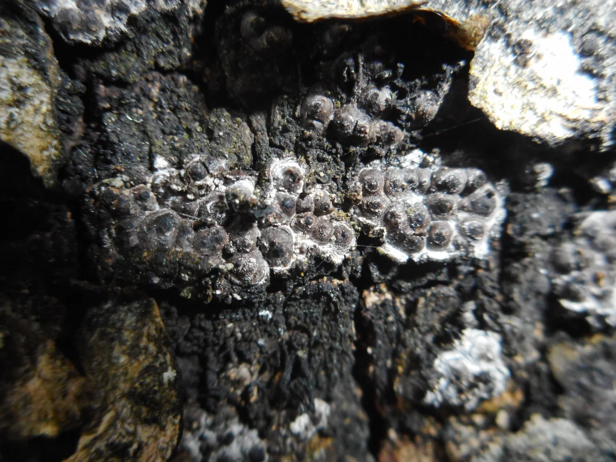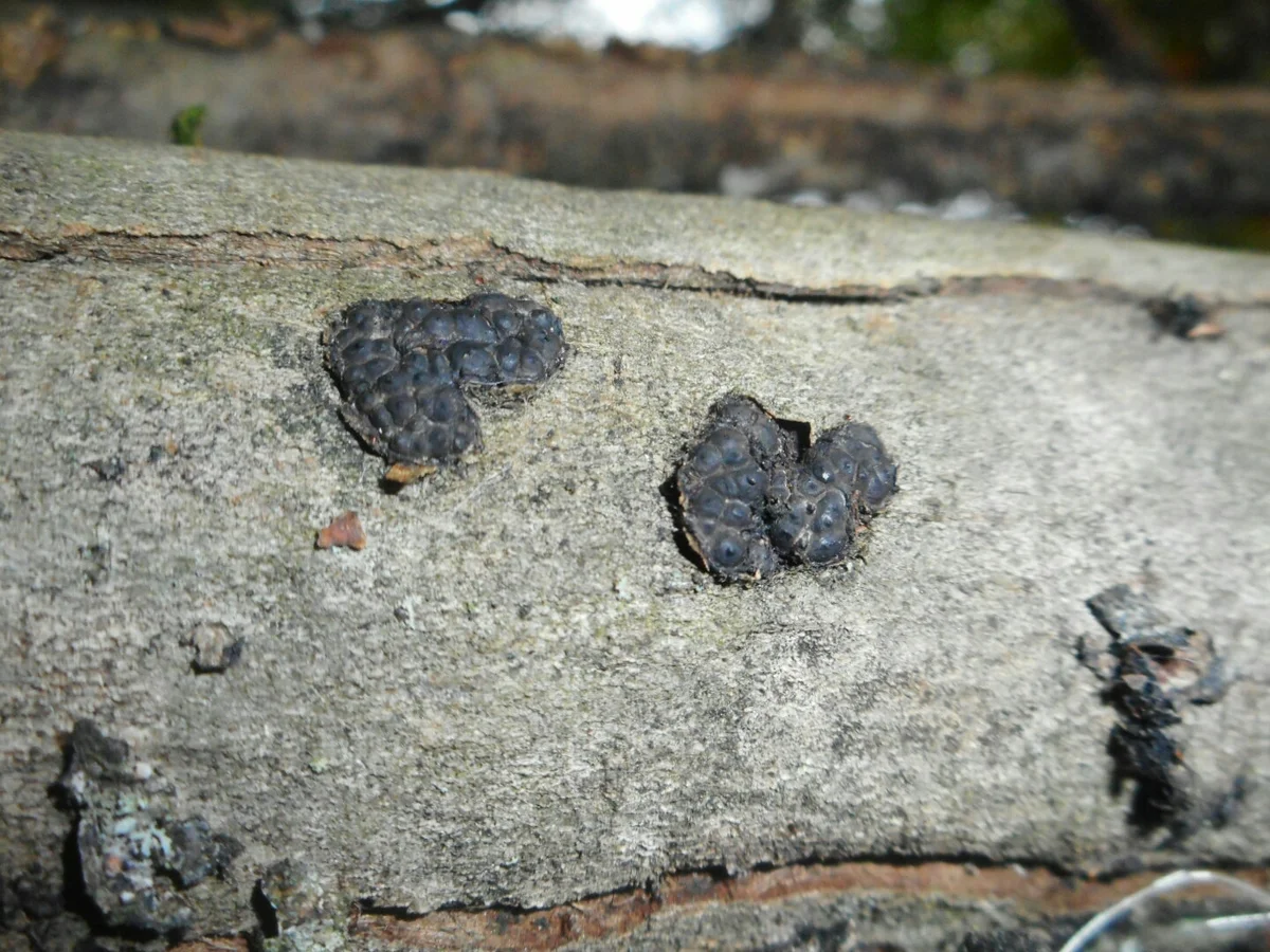 - Stromata dojrzałe – okrągłe, wyniosłe, spłaszczone, twarde, 2-5 mm średnicy i 1-2 mm grubości na zaczerniałej korze