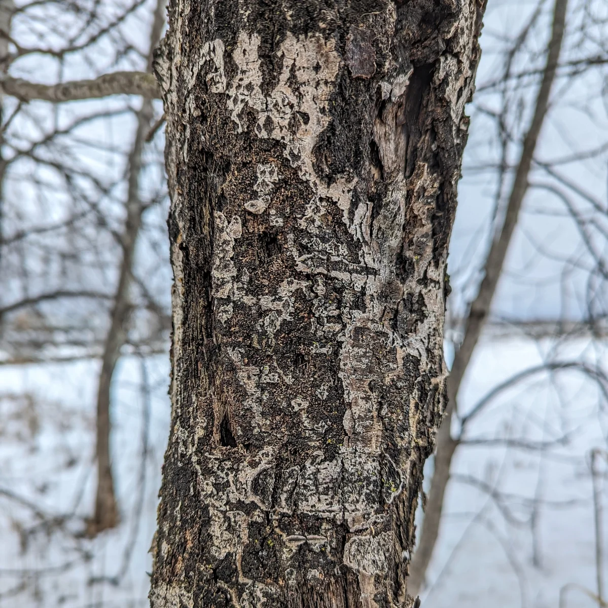 - Charakterystyczny blaszkowaty wzór kory (czarno-żółtawo-biały)