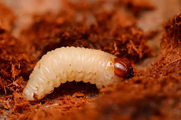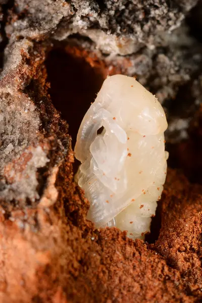 Występowanie licznych, drobnych zranień na strzałkach i bocznych pędach (towarzyszą im krople zaschniętej żywicy), powstałych w trakcie żeru uzupełniającego chrząszczy, w wyniku czego porażone pędy mogą obumierać. Pod korą gałęzi i pni drzew występują larwy, które drążą wężowate, nieregularne chodniki wzdłuż gałęzi, pnia, a nawet dochodzące do szyi korzeniowej, długości do 20 cm, o szerokości ulegającej stopniowemu zwiększeniu. Na końcu chodnika larwalnego, najczęściej w korze lub między nią a drewnem, rzadko zaś bezpośrednio w drewnie, znajduje się kolebka poczwarkowa otoczona grubymi wiórami; w kolebce poczwarkowej znajduje się biała lub kremowa poczwarka z wyraźnie widocznym ryjkiem.