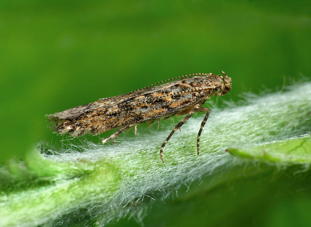 Poczwarka jest brązowa, może znajdować się w oprzędzie z jedwabistych nici. Motyle małe, o długości ciała około 7 mm i rozpiętości skrzydeł około 10 mm. Całe ciało jest szarobrązowe, ze srebrzystym połyskiem, na przednich skrzydłach czarne plamki. Skrzydła w spoczynku składane daszkowato ponad ciałem. Czułki długie, nitkowate.